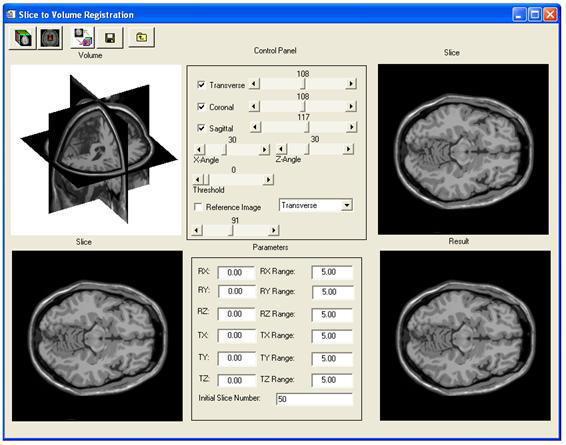 Slice to volume registration is used to register a two-dimensional image slice to a three-dimensional image volume. In this study, we registered live-time interventional magnetic resonance imaging (iMRI) slices with a previously obtained, high resolution MRI volume which in turn can be registered with a variety of functional images, e.g. PET and SPECT, for tumor targeting. We created and evaluated a slice-to-volume registration algorithm with special features for its potential use in iMRI-guided, radiofrequency (RF) thermal ablation. The algorithm features included a multi-resolution approach, two similarity measures, and automatic restarting in order to avoid local minima. Imaging experiments were performed on volunteers using a conventional diagnostic MR scanner and an interventional MRI system under realistic conditions. Both high-resolution MR volumes and actual iMRI image slices were acquired from the same volunteers. Actual and simulated iMRI images were used to test the dependence of slice-to-volume registration on image noise, coil inhomogeneity, and RF needle artifacts. To quantitatively assess registration, we calculated the mean voxel displacement over a volume of interest between slice-to-volume registration and volume-to-volume registration, which was previously shown to be quite accurate. More than 800 registration experiments were performed. For transverse image slices covering the prostate, the slice-to-volume registration algorithm was 100% successful with an error of < 2 mm, and the average and standard deviation was only 0.4 mm ± 0.2 mm. Visualizations such as combined sector display and contour overlay showed excellent registration of the prostate and other organs throughout the pelvis. Error was greater when an image slice was obtained at other orientations and positions, mostly because of inconsistent image content such as that obtained from variable rectal and bladder filling. These preliminary experiments indicate that MR slice-to-volume registration is sufficiently accurate to be able to aid image-guided therapy.